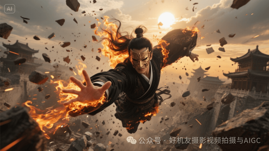 提示词:正面特写镜头,古装男子从高空俯冲而下,衣服燃烧成灰烬碎片飞散,发丝带着火焰剧烈向后飘动,左手前伸手掌,掌心出现烈火,超现实风格,电影级动态光影,粒子特效表现燃烧轨迹,超广角镜头增强视觉冲击力,背景是黄昏云层被气浪撕开。浑身黑气缭绕。脸的一半戴着黄金华丽面具。太阳在背景闪烁。背景是崩塌的宫殿,乱石纷飞。