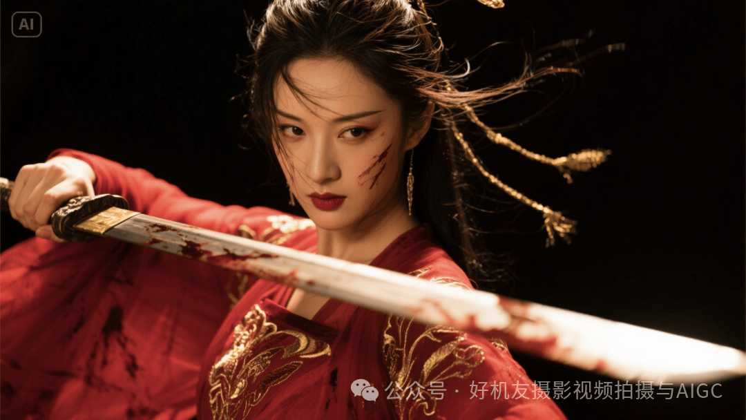 提示词:高饱和但低明度,高曝,过曝,暗调,伦勃朗光,强烈明暗对比,高反差,虞姬,红色轻纱水墨裙,金线刺绣,浴血奋战,凌乱,癫狂,耳边有两缕随风飘舞的碎发,黄金比例的五官,绝世美人,英气立体的五官,凌厉,舞剑,特写。
