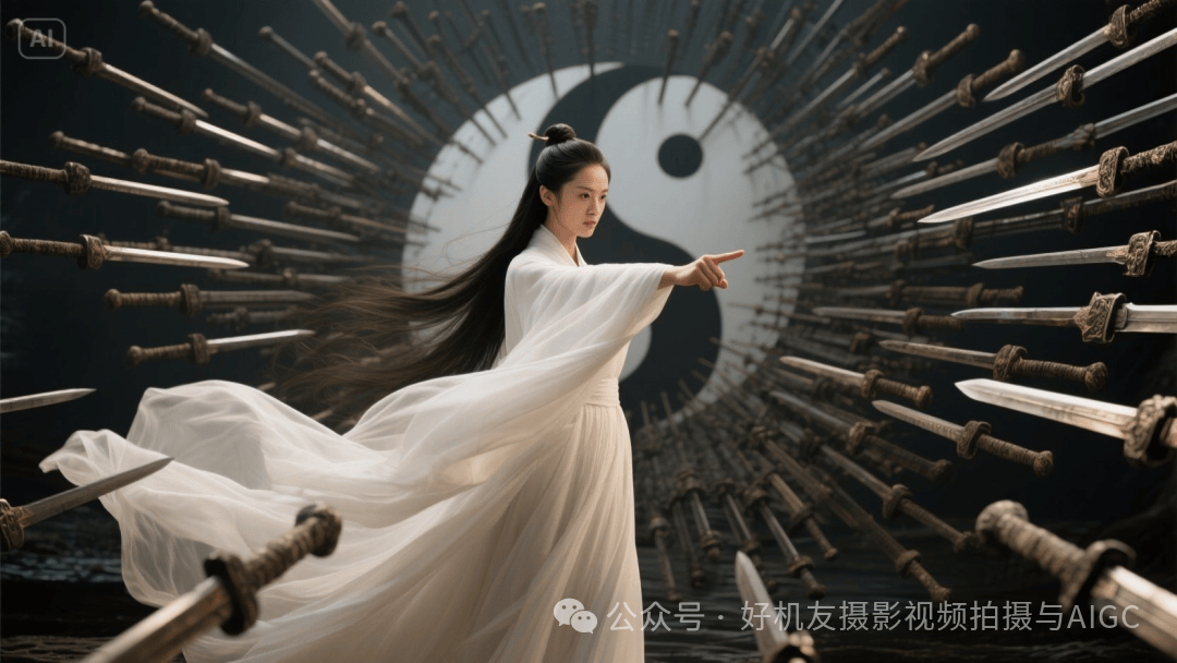 提示词:侧身特写,超广角视角,身穿白袍的美女修真者,长袍夸张地飘荡,长发飘逸,并起两根手指向前指,身后超大面积密密麻麻层层叠叠的长剑组成太极图造型剑河,所有长剑统一方向射向前方,剑身古朴,武侠大电影风格,背景昏暗简单,玄幻,古朴,唯美,惊艳,高清。