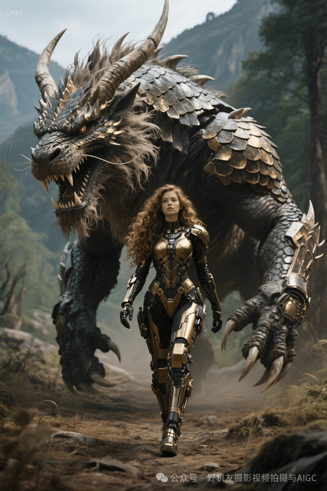 提示词:在荒野山林中一头巨型龙头鳞片遍身的猛兽缓缓走来,一个身穿机械装甲墨金色配色,头发长长的卷发美女在前面领导着走路,巨兽威严霸道四肢爬行走着。犄角尖锐突出,毛发凌乱飘逸,尖牙尖爪突出。