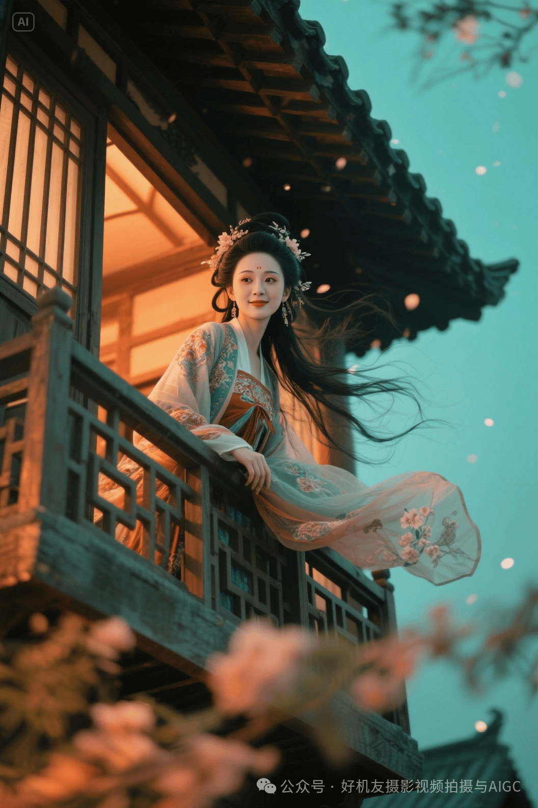 提示词:采用仰拍视角,在宋代小阁楼二楼窗户处,一位有着柳叶弯眉、桃花眼妩媚如丝、画着妖艳妆容、嘴角勾起浅笑的天下第一美女探出身子,深情望着镜头,凌乱发丝在动态模糊中狂舞,运用超广角透视拉伸空间,强烈胶片颗粒覆盖高噪点画面,扩散模糊渲染,青橙色调分离,超现实肖像摄影风格,艺术特写,神秘氛围。