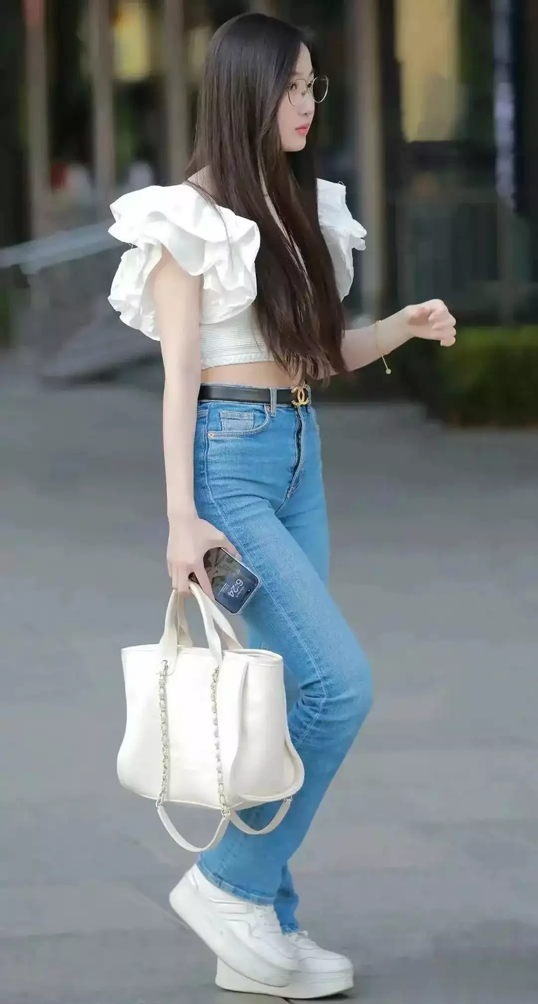不论是在街边还是大学校园,她总能吸引所有目光。她的穿搭向世界展示了自己的个性与品味。白色T恤、牛仔裤和白色运动鞋的组合展现了她的时尚态度和年轻活力。手中的白包更是彰显了她的高雅与时尚品味。