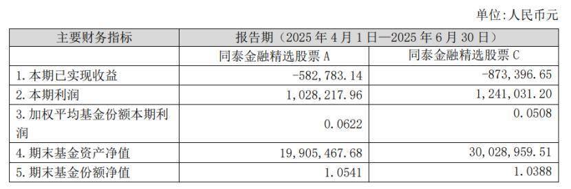 数据显示,2025年二季度,同泰金融精选股票A的基金份额净值为1.0541元,净值增长率为7.20%,已实现收益-58.27万元,利润102.8万元。