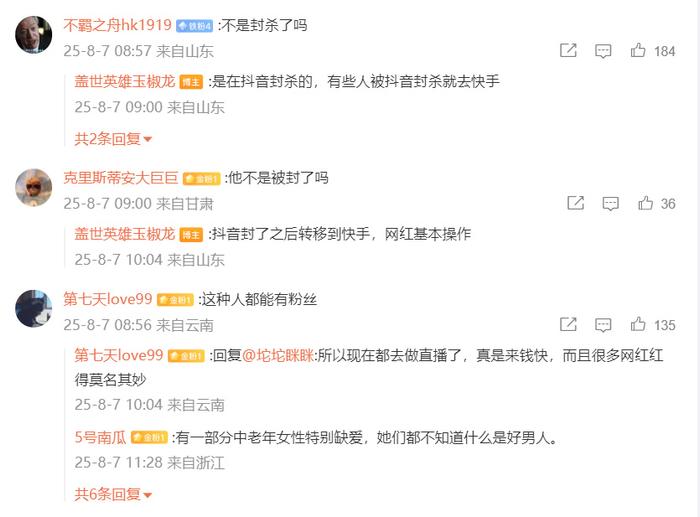 更值得注意的是,在另一平台上,一个名为 “秀才” 的账号已有 2.3 万粉丝,7 月 23 日至 8 月 6 日有 38 条直播记录,发布的 14 条单人出镜作品延续了以往风格,拍摄背景多为室内,与之前 “王某某” 账号出镜背景相似,IP 地址也相同。这一系列迹象,似乎都在暗示着 “秀才” 正试图以某种方式重回大众视野。