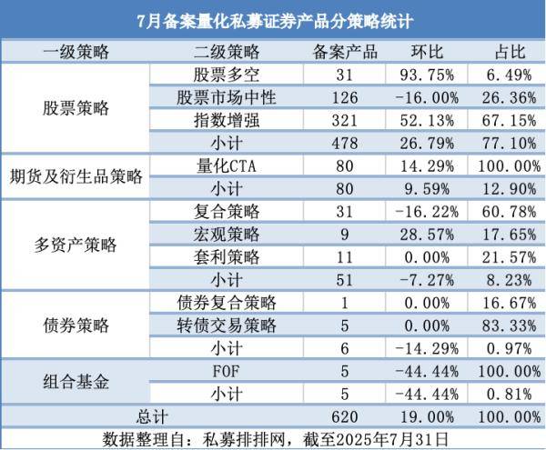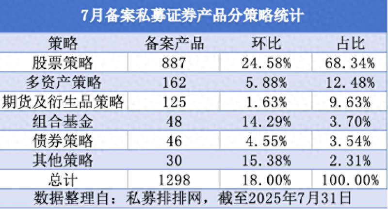 根据私募排排网数据,截至7月31日,2025年7月私募证券产品备案量达1298只,环比增18%,创下近27个月最高纪录。至此,今年私募备案总数已达6759只,同比增幅高达61.39%。