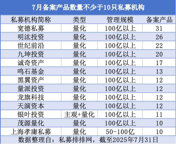 具体来看,宽德私募以7月份31只备案量登顶;明汯投资次之,在7月的产品备案数量为26只;紧随其后的是世纪前沿,该私募在7月份的备案产品达22只;九坤投资、诚奇资产各自以20只、17只紧随其后。鸣石基金、黑翼资产、量派投资、龙旗科技、天演资本、银叶投资、茂源量化等7家百亿量化机构备案量均达10只以上,分别为13只、12只、12只、12只、12只、11只和10只,共同构成行业头部方阵。此外,在50—100亿元规模的私募基金中,上海孝庸私募备案产品达到10只。
