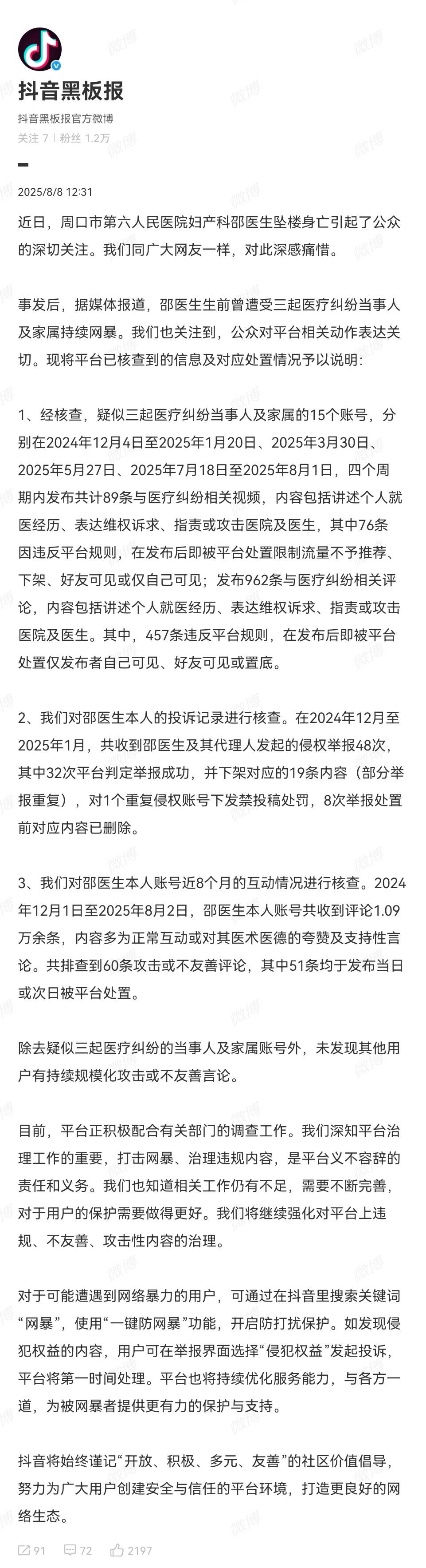 8月8日,抖音黑板报官方微博发布声明,针对周口市第六人民医院妇产科邵医生坠楼身亡事件,平台进行了详细的核查和处理。邵医生生前曾遭受三起医疗纠纷当事人及家属的持续网暴,对此抖音表示深切关注,并迅速展开调查。