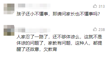 发布上述视频的乘客表示:“熊孩子妈妈说了句很经典的话——‘他还是孩子,你就不能体谅他吗?’”